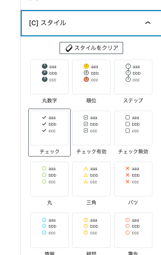 初期設定ではリストスタイルが「・」の状態になりますので変更をお願いします。